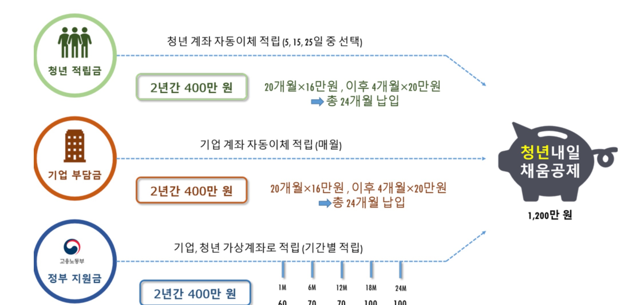 - 청년 본인이 2년간 400만 원(20개월간 16만 원, 이후 4개월간 20만 원)을 적립하면 기업(400만 원)과 정부(400만 원)가 공동 적립하며, 2년 후에는 만기공제금 1200만 원과 추가금액을 지원합니다.