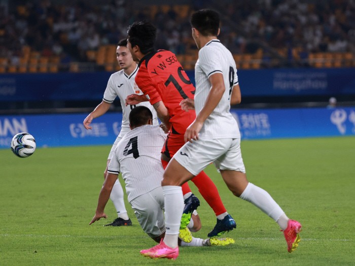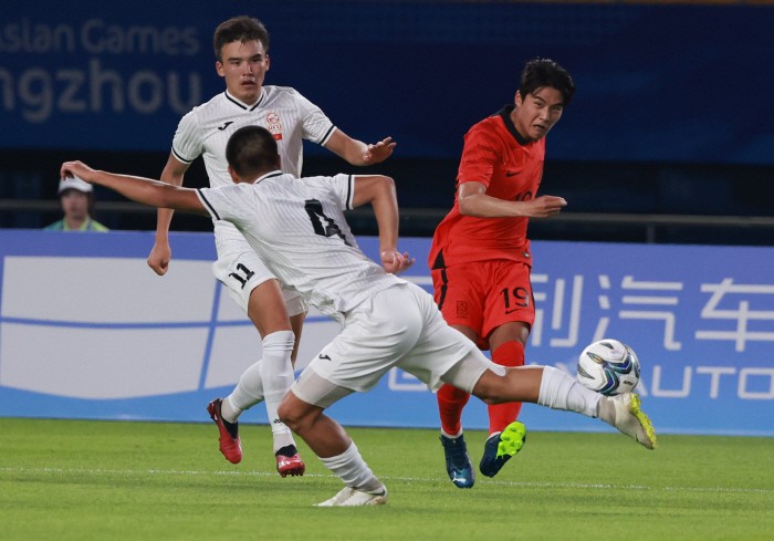 한국시간으로 27일, 항저우 아시안게임 남자 축구 16강전에서 황선홍 감독이 이끄는 남자 축구 대표팀은 키르기스스탄을 5-1로 대파하며 8강 진출을 확정했습니다. 이 경기에서 정우영은 멀티골을 성공시키며 대회 5골을 기록하였고, 백승호, 조영욱, 홍현석도 한 골씩 넣었습니다.