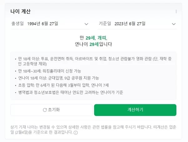 - 병역 의무와 술, 담배 구입에 있어서는 생일과 관계없이 '현재 연도-출생연도'를 기준으로 계산합니다.