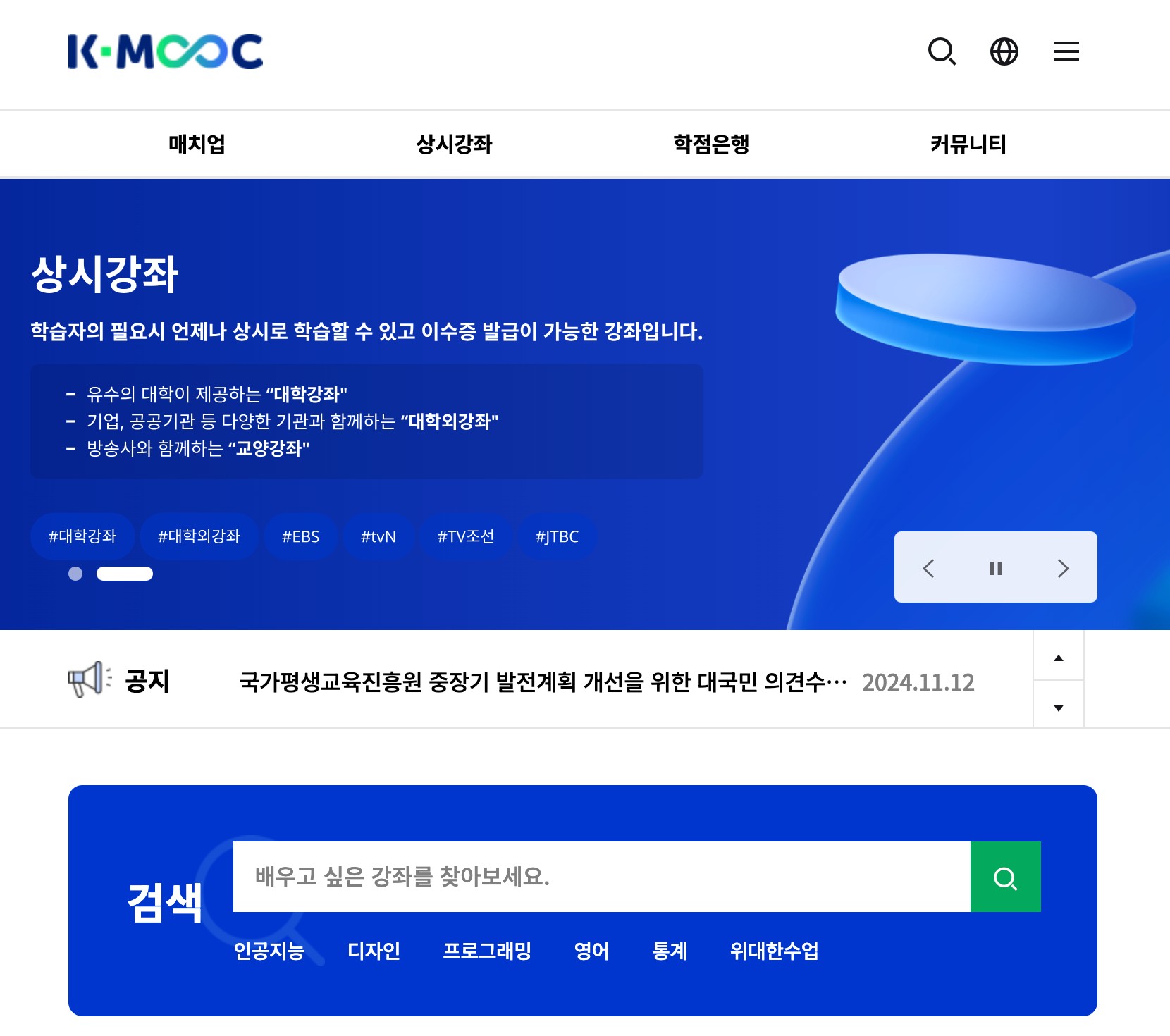 K-MOOC은 한국의 대학교들이 제공하는 온라인 공개 강좌 플랫폼으로, 다양한 주제의 강의를 무료로 수강할 수 있습니다.