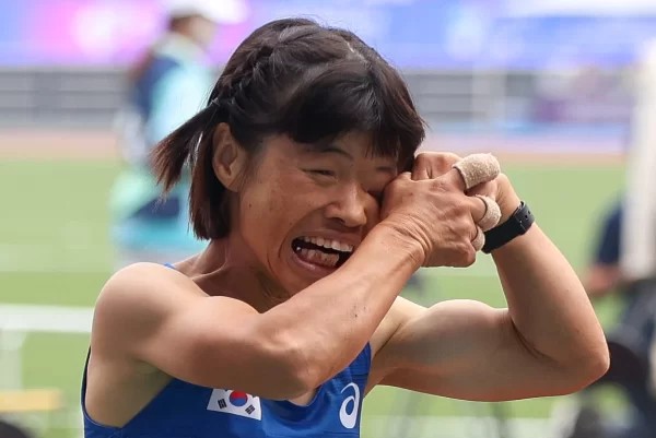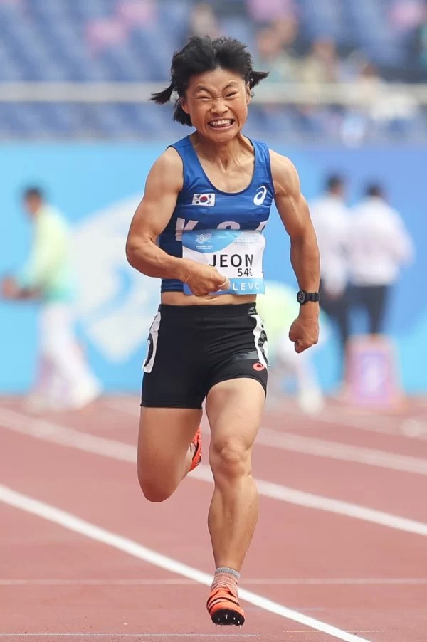 26일 중국 항저우 올림픽 스포츠센터 주 경기장에서 열린 2022 항저우 APG 육상 여자 T36 100m 결선에서 전민재(46) 선수는 15초 26의 기록으로 은메달을 획득했습니다. 7명의 선수들중 가장 늦게 출발한 전민재 선수는 평균나이 26세의 젊은 선수들을 제치며 막판 스퍼트로 2위에 오르는 놀라운 성과를 달성하게 되었습니다.