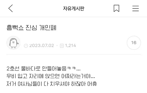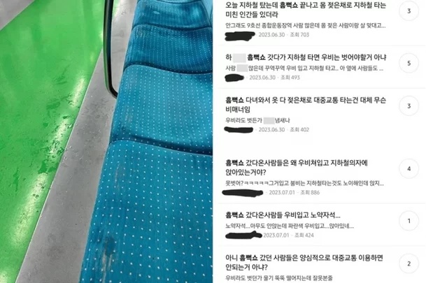 한 누리꾼은 "흠뻑쇼 민폐. 지하철 2호선을 물바다로 만들어 놨다"며 "우비 입고 자리에 앉으면 어쩌라는 거냐. 미화원들이 다 치워야 하지 않냐"고 지적했습니다.