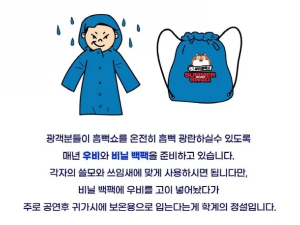 주최 측은 공연이 끝나고 귀가할때 보온을 위해 입으라며 관객들에게 우비와 비닐 가방을 제공하고 있습니다. 예매 공지에는 '비닐 가방에 우비를 고이 넣어두었다가 공연 후 귀가 시 입으면 된다'고 적혀있습니다. 하지만 일각에서는 흠뻑쇼 관객들에 대한 불만의 목소리가 나오고 있습니다. 우비를 입고 콘서트를 즐긴 일부 관객들이 물에 흠뻑 젖은 우비를 벗지 않고 대중교통을 이용했기 때문입니다.