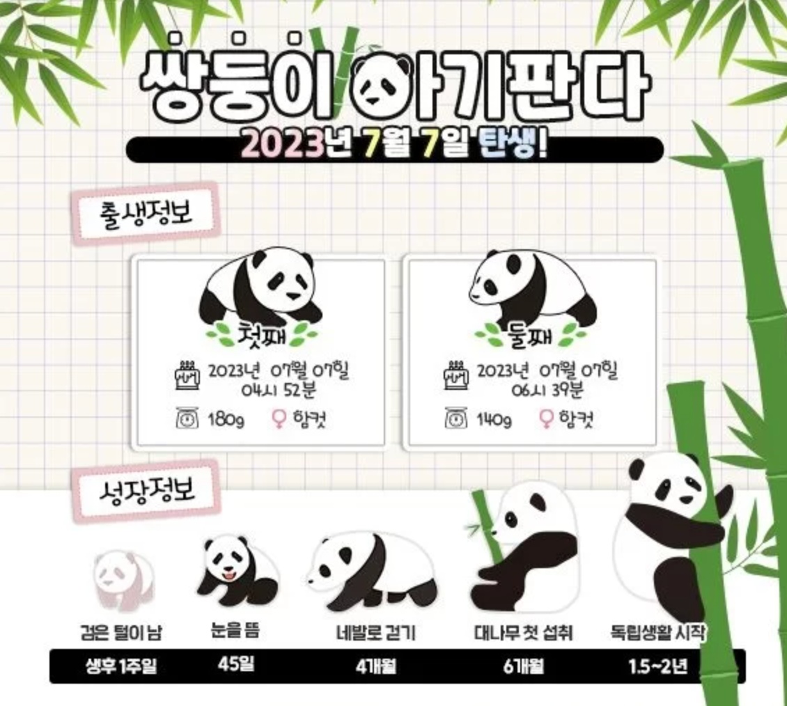 쌍둥이 아기 판다는 지난 7일 산모 아이바오가 진통을 시작한지 1시간여 만인 오전 4시 54분과 오전 6시 39분에, 1시간 47분 차이로 태어났습니다. 당시 첫째는 180g, 막내는 140g의 몸무게를 가지고 태어났습니다. 현재 몸무게가 98kg로 성장한 '맏언니' 푸바오(3세)는 2020년 7월 태어날 당시 197g이었습니다.