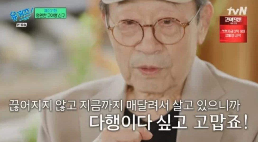 신구는 "나도 젊었을 때가 있었다. 살아오면서 이 순간이 그렇게 중요하다고 생각하지 않고 살았다. 마지막 고비에 오니까 숨을 쉴 수 있다는 게 고맙고 남의 도움 없이 걸어다닐 수 있다는게 고맙고 매사가 다 쏘 땡큐"라고 말했습니다.