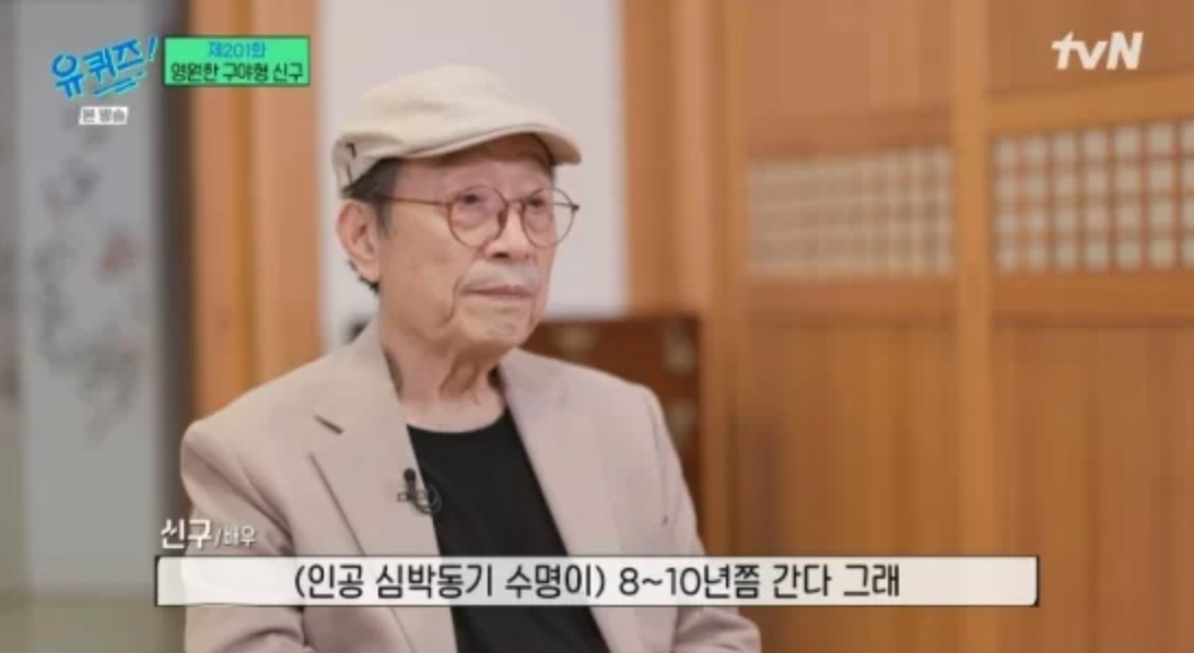 신구는 이날 "지난해 심부전증이라는 병이 왔다. 그래서 응급실에 가서 진찰해 보니까 이상이 있다더라. 심장이 정상적으로 뛰지 않고 천천히 느리게 뛴다고 한다. 그래서 이렇게 그냥 두면 뇌졸중이 된다더라. 그래서 여기 심장 박동 수를 조절햊는 심장 박동기를 찼다"고 밝혔습니다. 신구는 "이놈이 본래 심장이 천천히 뛰면 알아서 박동수에 맞춰서 전기 자극을 줘서 정상 박동을 하게 만든다고 한다. 8~10년쯤 간다고 한다. 그때 쯤이면 난 없을 테니까. 충분하다"라며 설명했습니다.