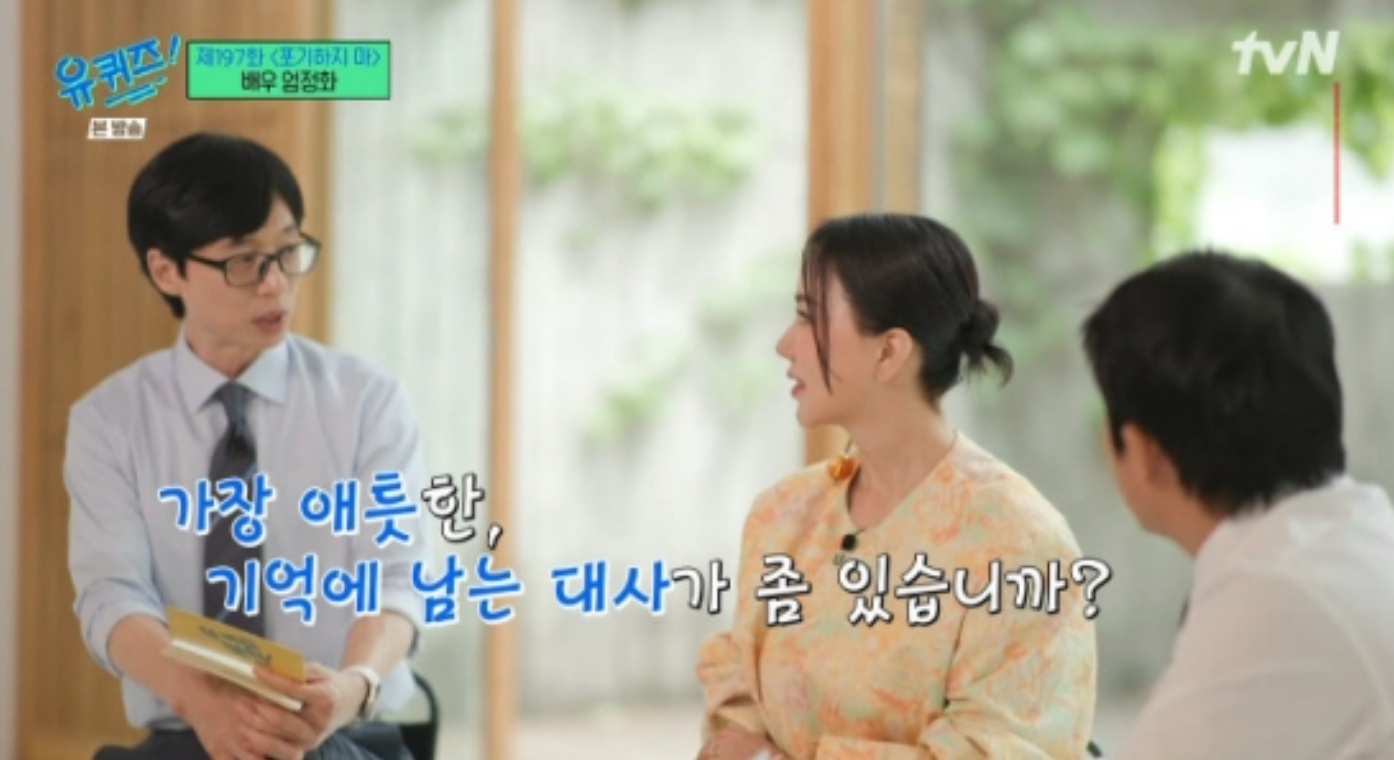 엄정화는 "감정이 막 올라오는 거다. 그래서 '잠시만요' 이래서 카메라 없는데 가서 한 30분을 엉엉 울었다. 또 울었다. 그런데 그건 기쁨의 눈물이었다"라며 웃음을 터트렸다. 특히 유재석은 "가장 애틋한 기억에 남는 대사가 있냐"라며 질문했고, 엄정화는 "차정숙의 대사인데 의사로 돌아가지 못하게 남편의 방해공작이 이어질 때 정숙이가 그런다. "내가 도와달라고 말을 하진 않아. 근데 걸아갈 수 있게만 해줘"라고 이야기한다. 그 대사가 할 때 너무 좋았고 또 "내가 행복해질 수 있는 길은 나 스스로 찾아볼게" 그 대사도 너무 좋았다고 말했습니다.