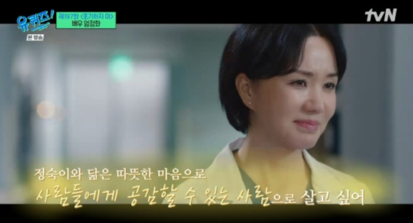 가수 겸 배우 엄정화가 TvN '유 퀴즈 온 더 블럭'에 나와 JTBC 토일드라마 '닥터 차정숙' 첫 방송 후 눈물을 흘렸음을 고백했습니다. 7일 방송된 케이블채널 tvN '유 퀴즈 온 더 블럭'에서는 포기하지 마 특집이 펼쳐진 가운데, 엄정화가 어떤 어려움에도 포기하지 않는 의지의 인생사를 나누었습니다.