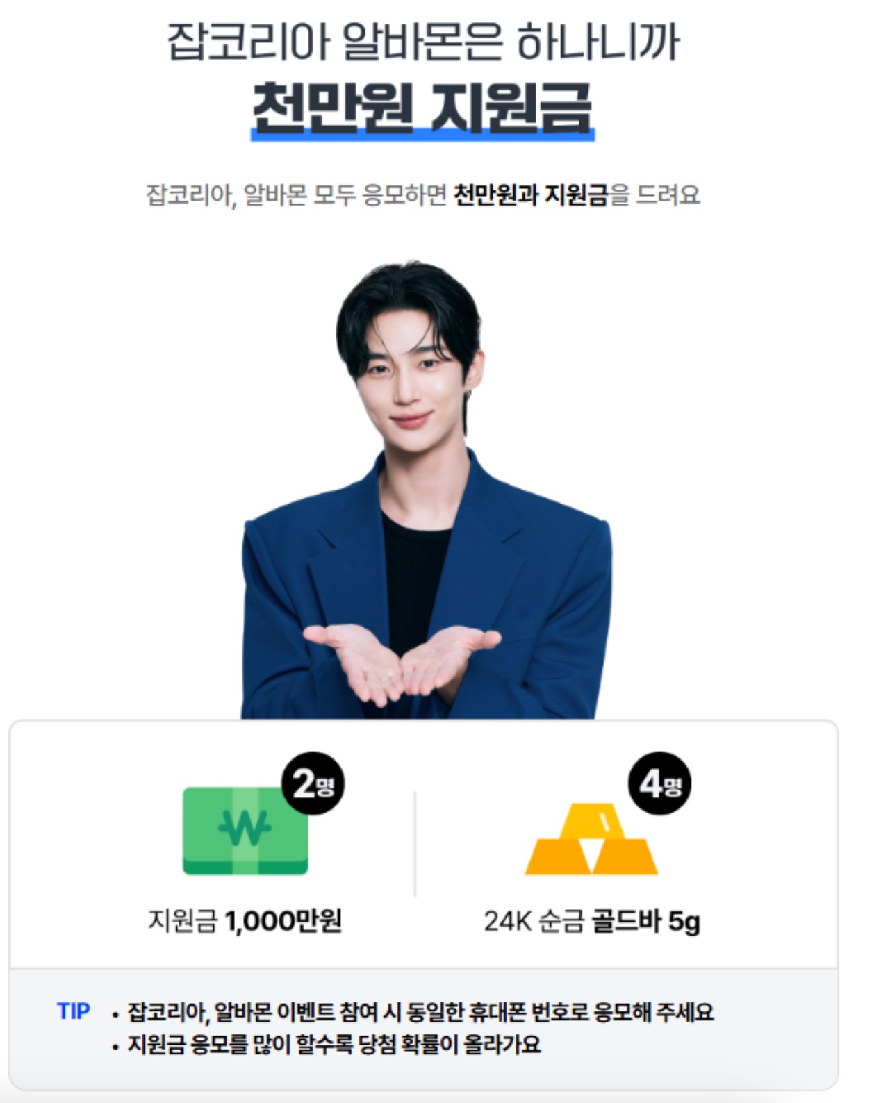 이번 이벤트에 잡코리아와 알바몬 양쪽 모두에서 참여시 1천만원 당첨기회가 더 늘어나니 꼭 두 앱 모두 응모해 보세요!