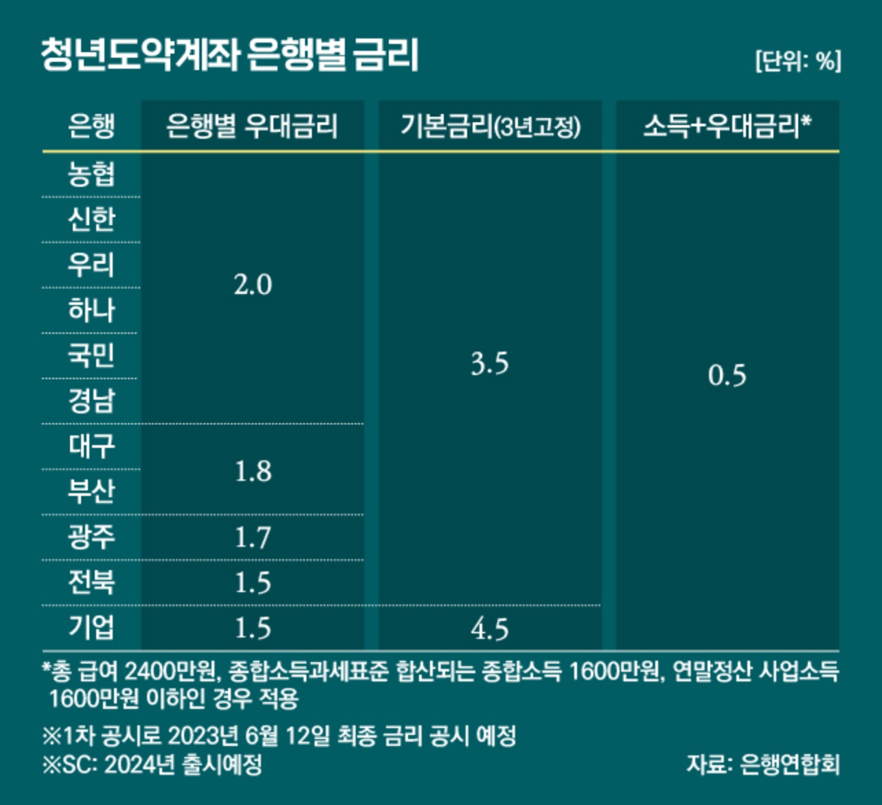 청년도약계좌는 청년들의 자산 형성을 지원하기 위한 정책 금융상품입니다. 매달 최대 70만원을 납입할 수 있으며, 계약 기간은 5년입니다. 개인 소득과 납입 금액에 따라 정부의 기여금이 지원되며, 이자 소득은 비과세 혜택을 받을 수 있습니다. 취급 은행들의 1차 금리 공시를 살펴보면 평균 6% 수준으로, 시중 은행의 예금 및 적금 상품보다 높은 수준입니다.