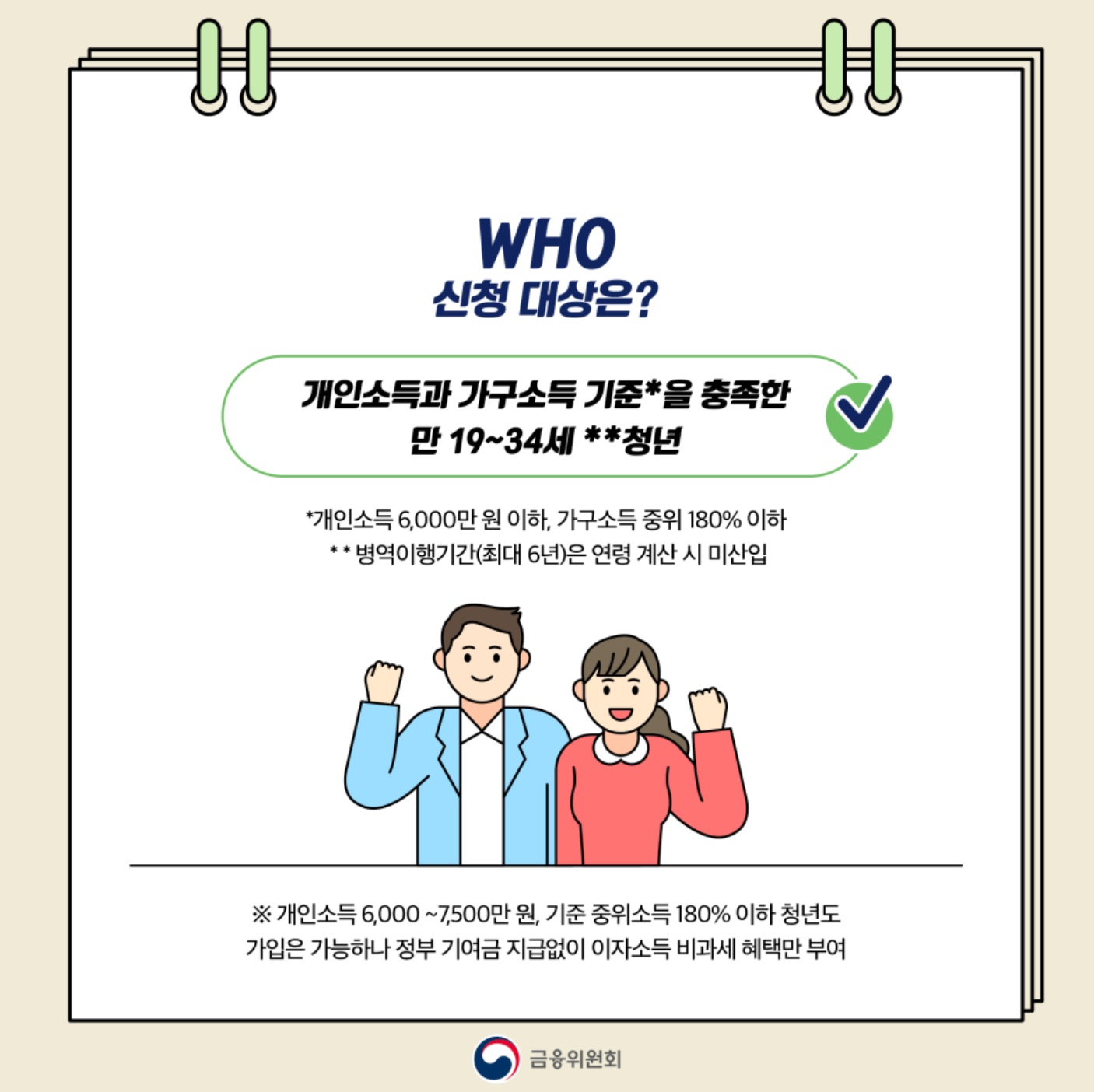 개인소득과 가구소득 기준을 충족한 만 19세~34세 청년이 신청대상입니다.