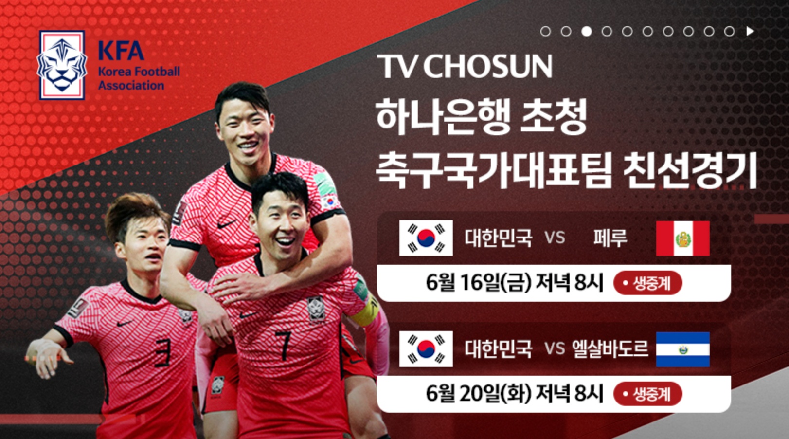 대한민국 축구 대표팀(FIFA랭킹 27위)은 16일 오후 8시에 부산 아시아드주경기장에서 페루(FIFA랭킹 21위)와 경기를 치룰 예정입니다. 20일 오후 8시에는 대전월드컵경기장에서 엘살바도르(FIFA랭킹 75위)와 대결할 예정입니다.