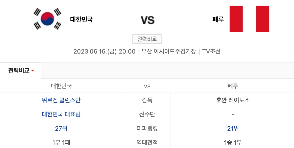 아래 TV조선 중계 바로가기를 통해 대한민국 vs 페루 A매치 평가전 실시간 중계를 볼 수 있습니다.