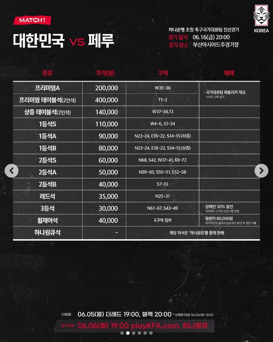| 프리미엄 A석 | 200,000원 (대표팀 유니폼 레플리카가 선물로 제공됩니다.) | |