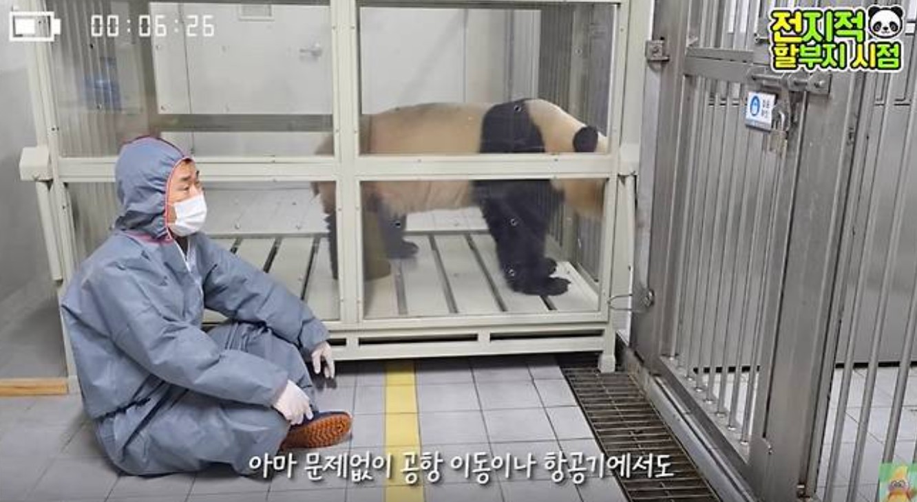 푸바오는 중국으로 향하기 전 비행기 박스 적응 훈련을 진행하고 있습니다. 이를 위해 강철원 사육사와 함께 훈련을 받고 있으며, 이에 관한 영상이 유튜브 채널 '말하는 동물원 뿌빠 TV'에 공개되었습니다.