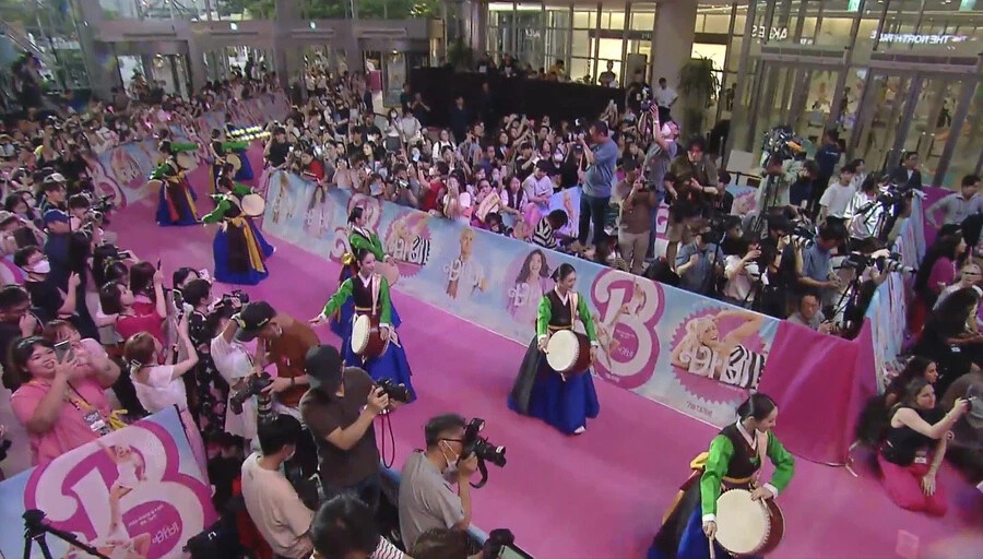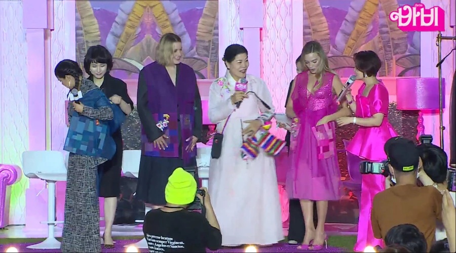 이날 행사에서 팀 바비는 한국 팬들을 위해 포토 타임을 갖고 인사를 전했습니다. 또, 진행자 박경림의 영화 관련 질문에도 친절히 답변하는 모습을 보였습니다. 문제는 여기서부터 입니다. 영화 관련 질문 이후 'K-무용 공연'으로 전환되어 '한국 문화재 재단 예술단'의 공연이 시작되었습니다. 한복을 입은 무용수들이 한국 전통 악기와 함께 무용을 선보였으며, 이후에는 한복 장인 박술녀가 '깜짝 게스트'로 등장하였습니다. 행사가 끝난 뒤 박술녀는 마고 로비에게 한복을 선물했고, 한복 주머니에 자신의 한복 가게 명함을 넣어 팬들의 비난을 받고 있습니다.
