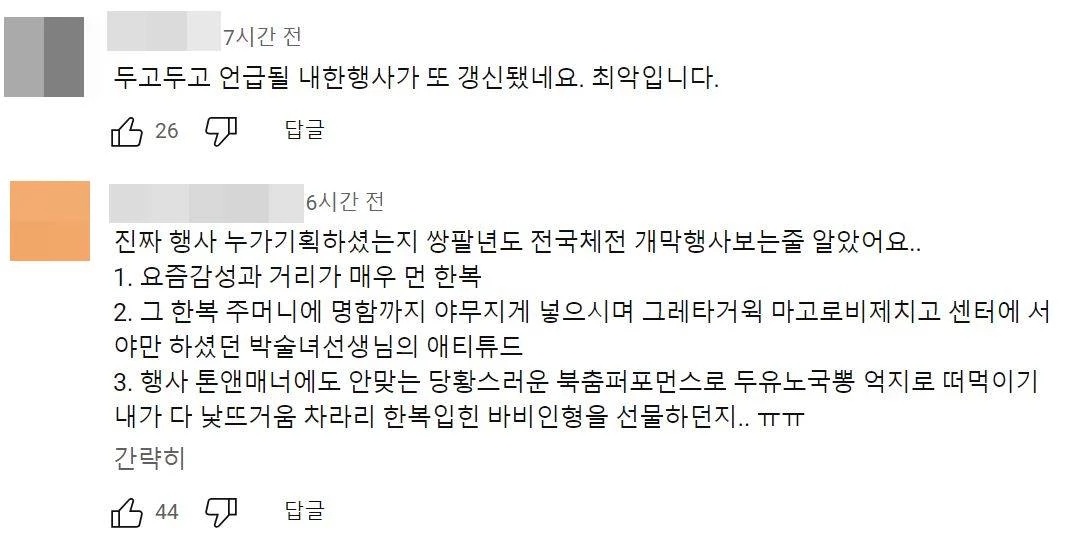 이날 행사가 종료된 후 온라인 커뮤니티에는 행사 기획에 대하 불만이 쏟아져 나오고 있습니다. 특히, 온라인 커뮤니티 '디시인사이드'에는 한 누리꾼이 '무슨 기쁨조냐'라는 제목의 글과 함께 행사가 끝난 뒤 팀 바비 측이 국악 공연을 한 무용수들과 함께 찍은 인증 사진을 게재하였습니다. 또 다른 누리꾼들도 온라인 커뮤니티 '해연갤'을 통해 자신들의 의견을 전하였는데요. "오늘 바비 행사 보니까 잊고 있었던 10년 전의 데자뷔가 떠올랐다"며, "10년 전인 2013년에 내한했던 아만다 사이프리드의 경우도 마찬가지였다. 이날도 아만다의 생일이었는데 꾸역꾸역 한복을 입힌 박술녀가 눈에 띄었다"라고 말했습니다. 이 외에도 많은 누리꾼들이 행사에 대한 불만을 표출하였으며, 이에 대한 비판은 계속되고 있습니다.