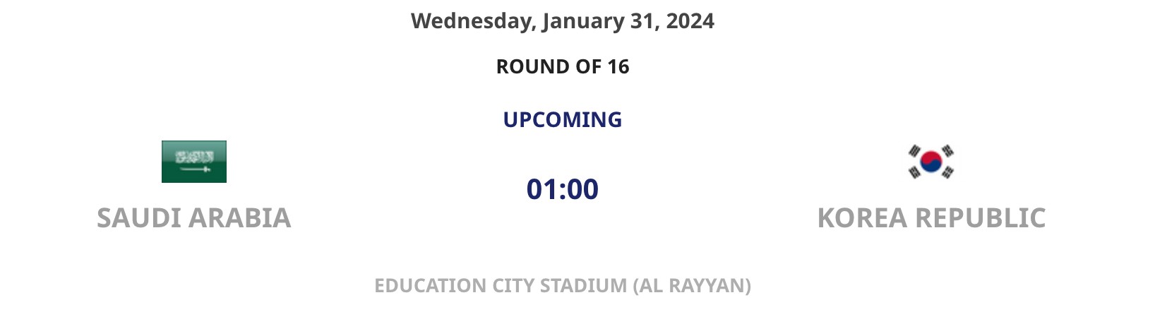 한국은 E조 2위로 16강에 올랐고, 상대팀인 사우디아라비아는 F조에서 태국, 오만, 키르기스스탄을 이기며 1위로 진출했습니다. 한국과 사우디의 맞대결은 오는 31일 수요일 새벽 1시 카타르의 에듀케이션 시티 스타디움에서 열리게 됩니다. 사우디 팬들의 열기가 뜨거운 만큼 한국 선수들도 절대 기죽지 말고 자신감으로 밀고 나가 좋은 경기 보여주었으면 좋겠습니다. 축구는 기세 아니겠어요~??