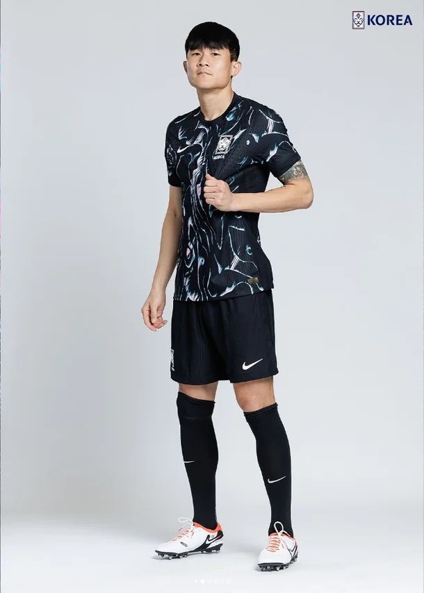 원정 유니폼은 상하의 검정색을 기반으로 하고 있습니다. 이를 통해 나이키는 나전칠기를 재해석하여 한국의 뛰어난 장인 정신과 전통, 진보의 조합을 상징하였습니다. 짙은 검정색과 진주핵 디지털 패턴의 대조는 한국의 아름다운 미를 표현하고 있으며, 깃 부분에는 호랑이의 발톱 문양을 새겨 넣어 홈 유니폼과 일관성을 유지하고 있습니다.