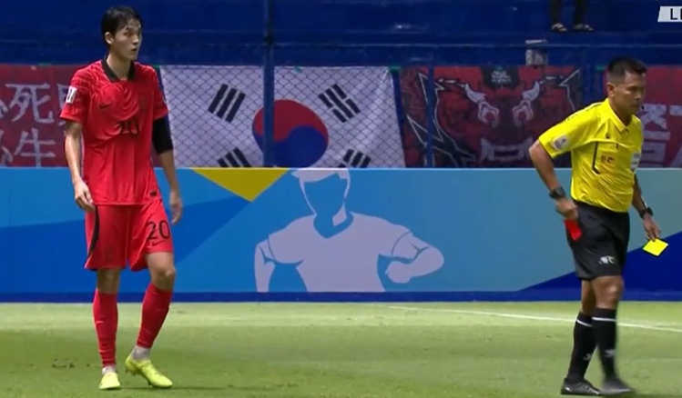 한국에게는 운이 따르지 않았습니다. 주심의 판정에 의문이 들었던 전반 막판에 경고 누적으로 고종현이 퇴장당하며 선제골을 내주는 최악의 상황이었습니다. 전반 초반에 경고를 받았던 중앙 수비수 고종현이 전반 종료 직전에 또 다른 경고를 받아 경고 누적으로 퇴장했습니다. 이어진 프리킥을 일본의 나 와타 가쿠가 골로 연결했습니다. 선제골을 이렇게 허용한 한국은 공격수 양민혁을 교체하고 수비수 유민준을 투입하여 전술을 재조정했습니다.