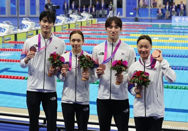 이후 약 1시간 뒤, 혼성 혼계영 400m에 출전하여 역영을 펼치며 동메달을 획득하였습니다. 황선우 자신도 동메달을 목에 걸었는데, 이로써 황선우는 박태환 이후 13년 만에 수영에서 다관왕에 성공하는 선수가 되었습니다. 박태환은 2006 도하 대회와 2010 광저우 대회에서 각각 3관왕을 차지한 적이 있었는데, 황선우가 이를 이루면서 역사적인 기록을 세웠습니다.