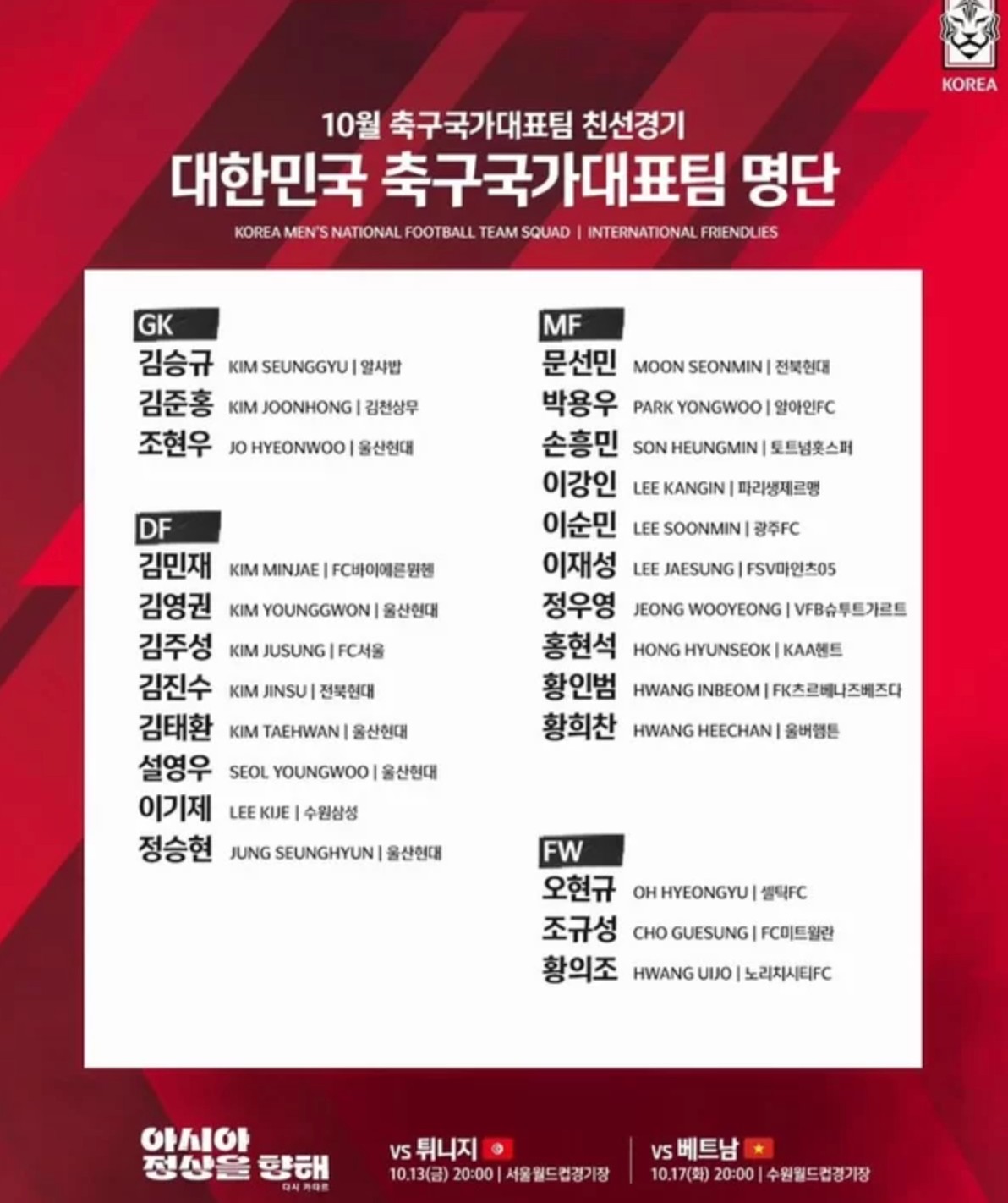 이번 명단에는 지난 9월에 유럽 원정에서 활약한 선수들이 그대로 이름을 올렸습니다. 주장 손흥민(토트넘)을 비롯하여 김민재(바이에른 뮌헨), 이재성(마인츠), 황인범(츠르베나 즈베즈다), 황희찬(울버햄튼), 조규성(미트윌란)등 주축 멤버들이 이번 경기에 참가합니다. 현재 항저우 아시안게임에서 활약 중인 이강인(파리 생제르맹)을 비롯해 설영우(울산현대), 정우영(슈투트가르트), 홍현석(KAA 헨트)도 10월 A매치에 합류합니다.