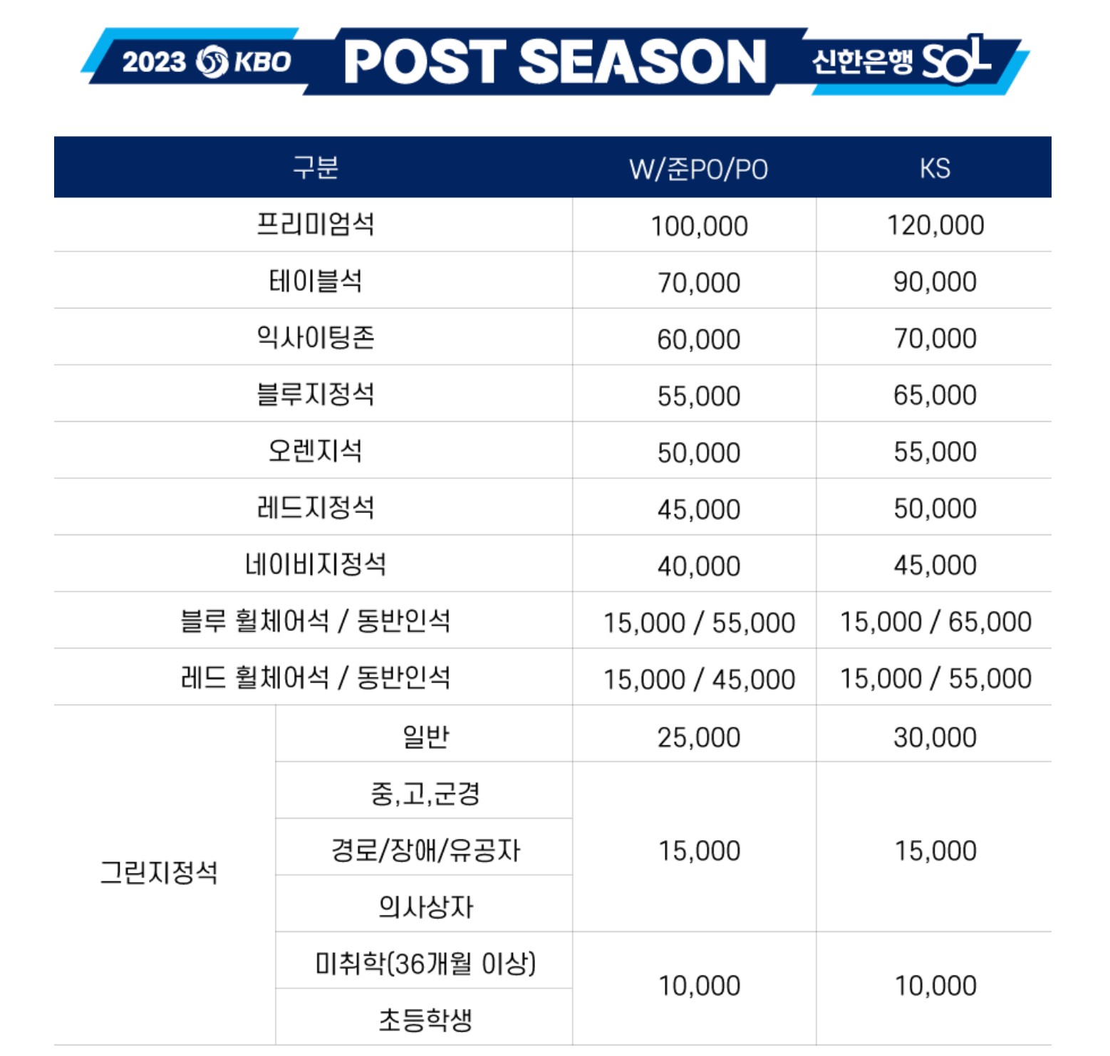 티켓 가격은 현재 한국시리즈에 직행하는 LG트윈스의 홈구장인 잠실구장 기준 가격입니다.