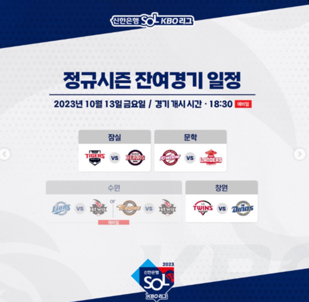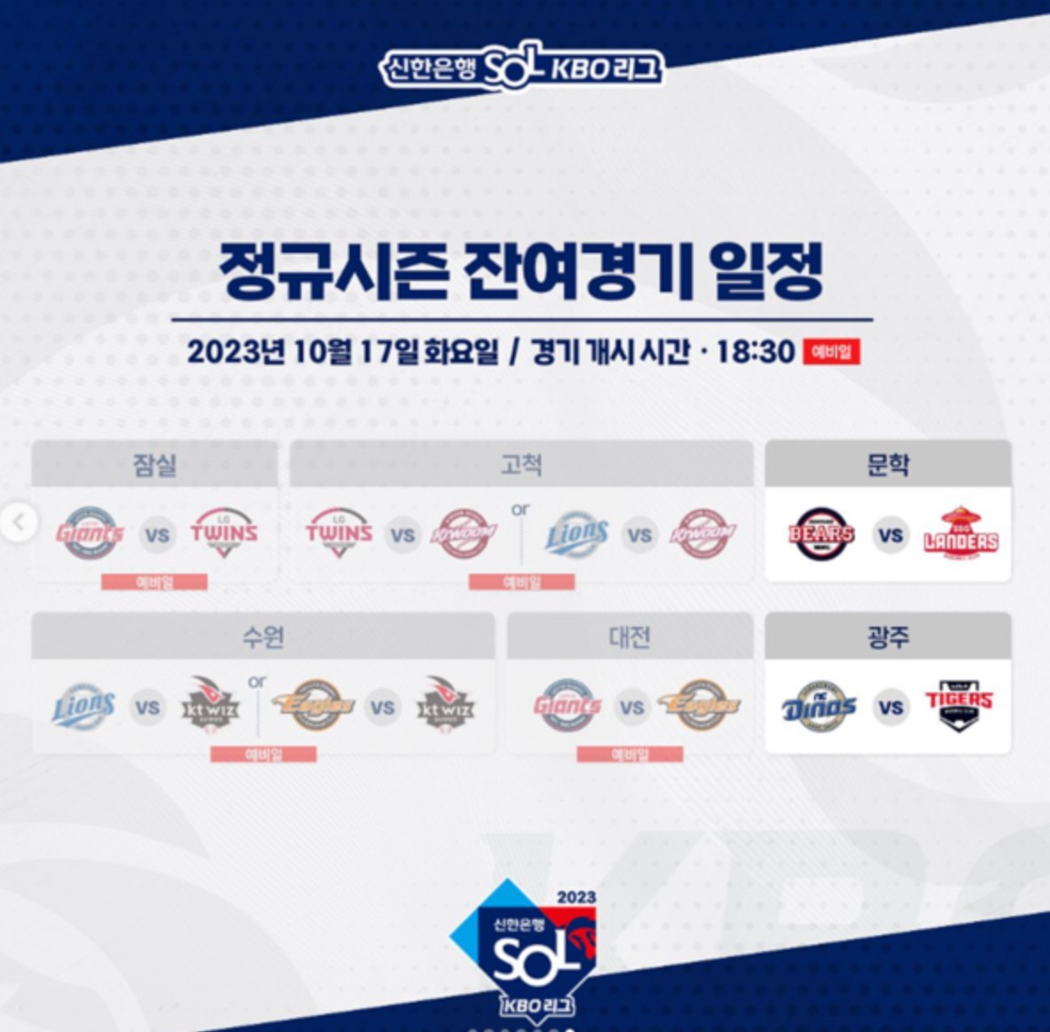 원래는 10월 12일부터 포스트 시즌이 시작될 예정이었으나 가을비로 경기가 계속 뒤로 밀렸습니다. 그 결과로 정규 시즌 종료일은 10월 10일에서 10월 17일로 늦춰졌습니다. 그러나 10월 6일 정규 시즌 잔여경기 일정이 재편성되면서 포스트 시즌 일정 시작은 10월 19일로 정해졌습니다. 이 모든 일정이 차질 없이 진행 된다면, 11월 15일에는 포스트시즌이 마무리 될 것으로 예상됩니다.