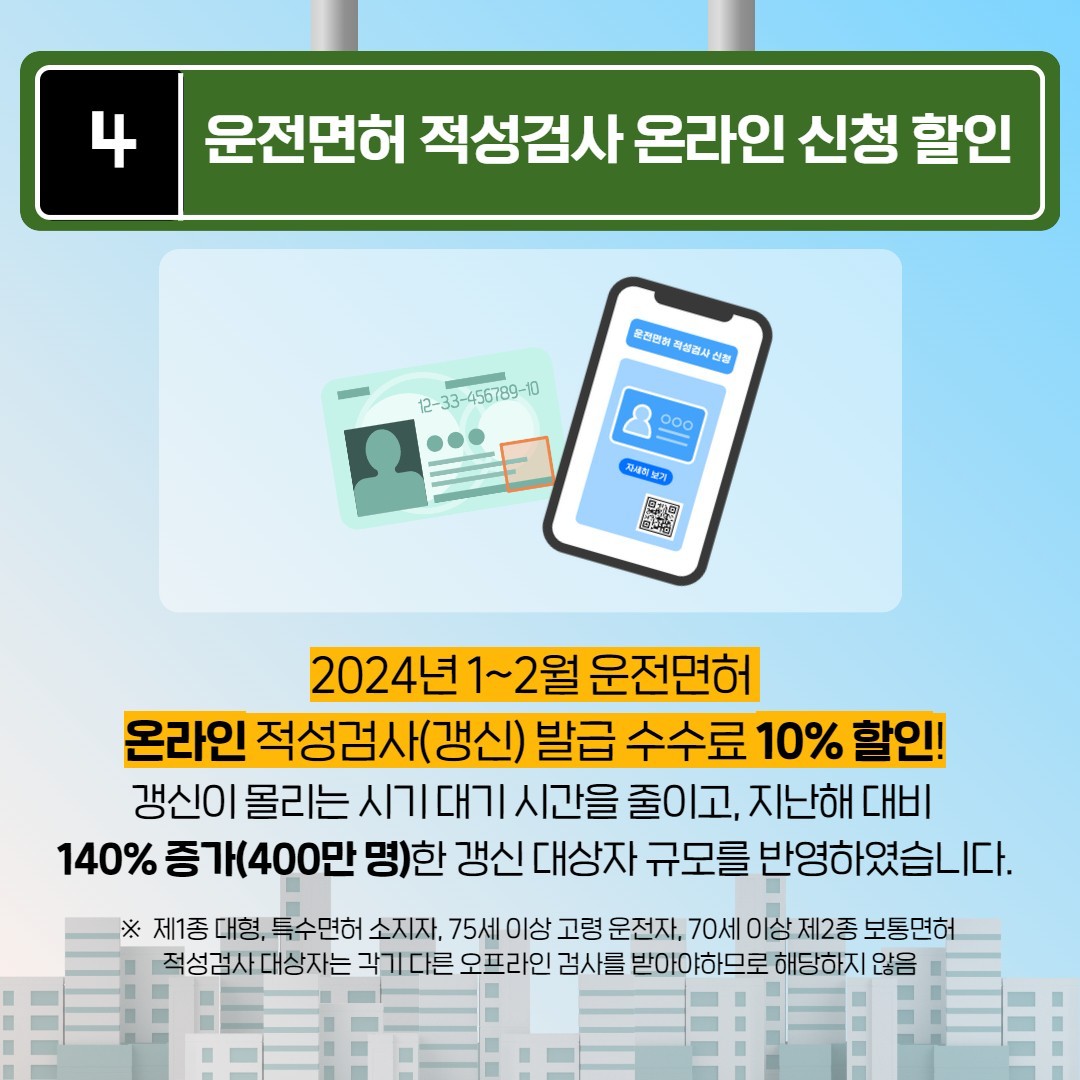 2024년 1~2월 동안 운전면허 적성검사(갱신) 온라인 신청 수수료가 10% 할인됩니다. 이 기간에 갱신을 계획하시는 분들은 온라인으로 빠르고 편리하게 적성검사를 신청할 수 있으며, 지난해에 비해 대기 시간이 줄어들 것으로 예상됩니다. 다만, 1종 대형, 특수면허 소지자, 75세 이상 고령 운전자, 70세 이상 2종 보통면허 적성검사 대상자는 여전히 오프라인 검사를 받아야 합니다.