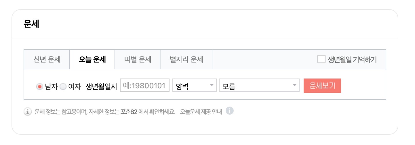 다음 역시 무료로 2024 신년운세 서비스를 제공하고 있습니다. 띠별로 맞춰진 자료를 통해 미래의 운세를 확인할 수 있으며, 별자리와 생년월일까지 조회가 가능합니다. 무료사이트 중에서도 많은 이용자들이 찾는 편이라고 합니다.