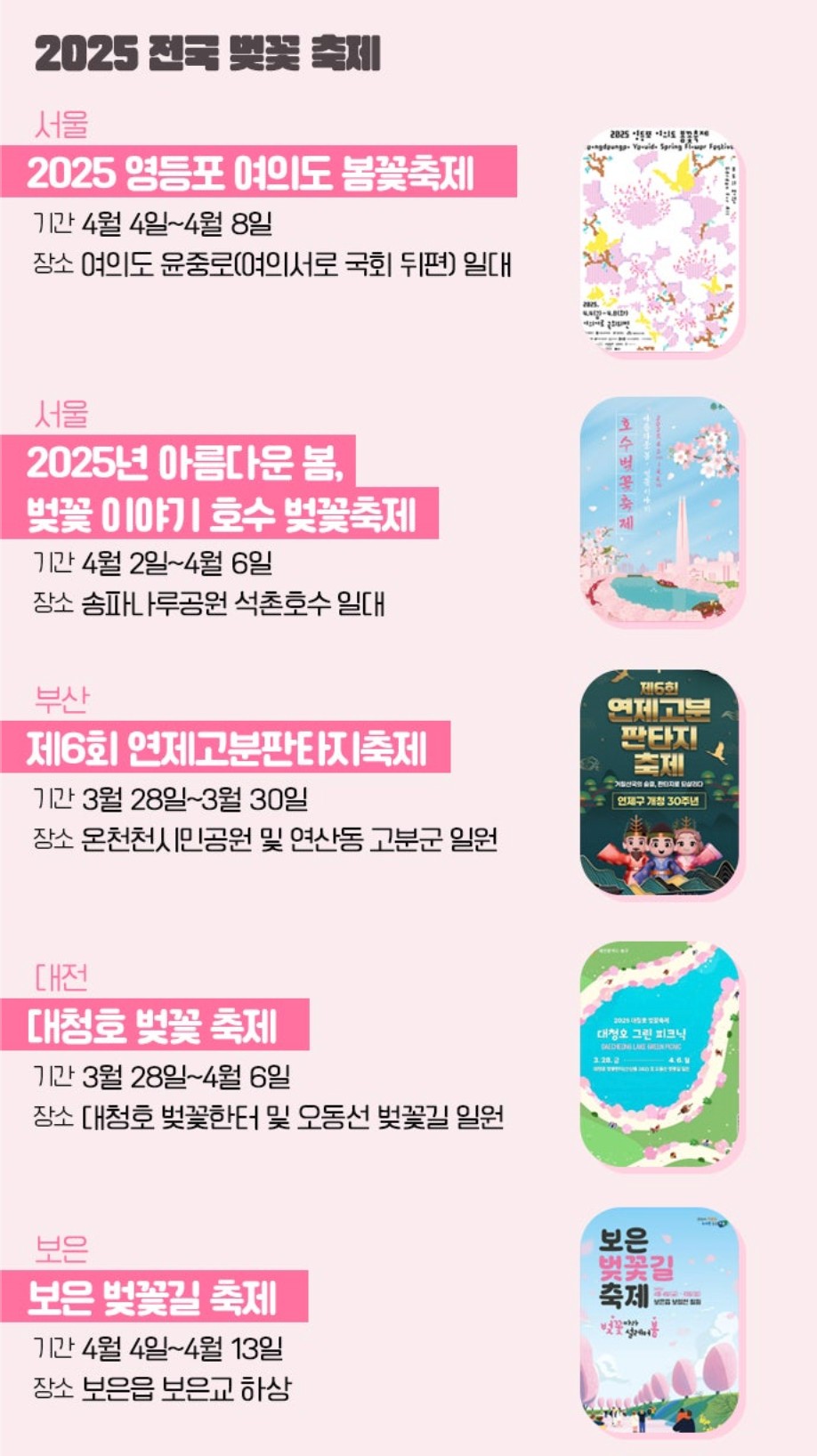 2025년 봄, 전국 곳곳에서 펼쳐지는 벚꽃의 향연을 놓치지 마세요. 가족, 연인, 친구와 함께 하는 벚꽃 여행은 일년 중 가장 아름다운 추억이 될 것입니다. 지금 바로 일정을 확인하고 계획을 세워보세요! 여러분만의 특별한 벚꽃 순간을 #2025벚꽃축제 #봄꽃여행 해시태그와 함께 공유해주세요. 가장 아름다운 벚꽃 아래서 여러분의 봄을 기다리고 있겠습니다.