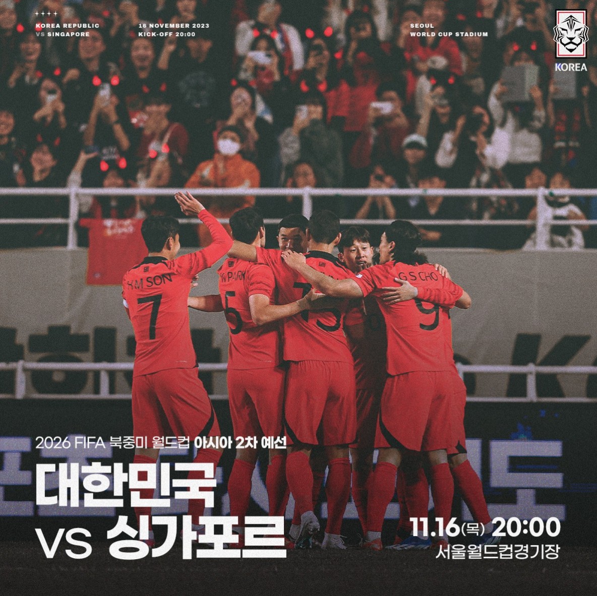 11월 16일 목요일 오후8시에 진행될 한국 대표팀과 싱가포르와의 경기 티켓에 관한 판매 일정은 추후 공지될 예정입니다. 축구 팬들은 흥미진진한 예선전을 지지하며, 대한민국 축구대표팀의 성공적인 월드컵 본선 진출을 기대하고 있습니다.