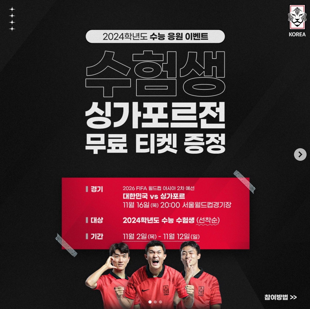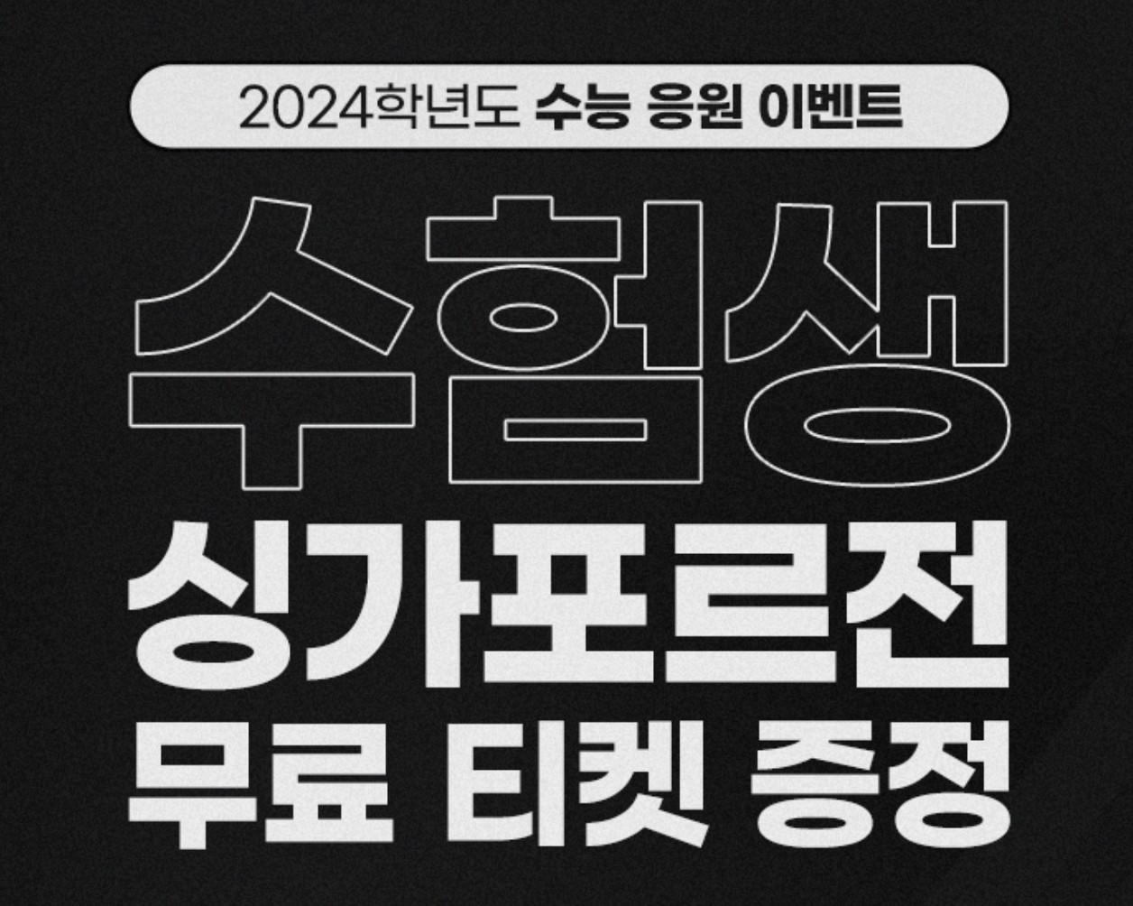 2026 월드컵 아시아 2차 예선 경기가 수능이 열리는 날에 치러집니다. 이를 고려하여 특별한 이벤트가 진행됩니다. 수험생 2000여명을 대상으로 선착순 무료 티켓 이벤트가 열릴 예정입니다. 수험생은 사전에 PLAYKFA 홈페이지에서 수험생 쿠폰을 다운로드한 후, 일반 예매 시 '수험생 할인석'을 선택하여 결제하면 SG석과 SH석 입장권을 무료로 받을 수 있습니다. 티켓 사격은 무료이지만 예매 수수료는 발생할 수 있습니다.