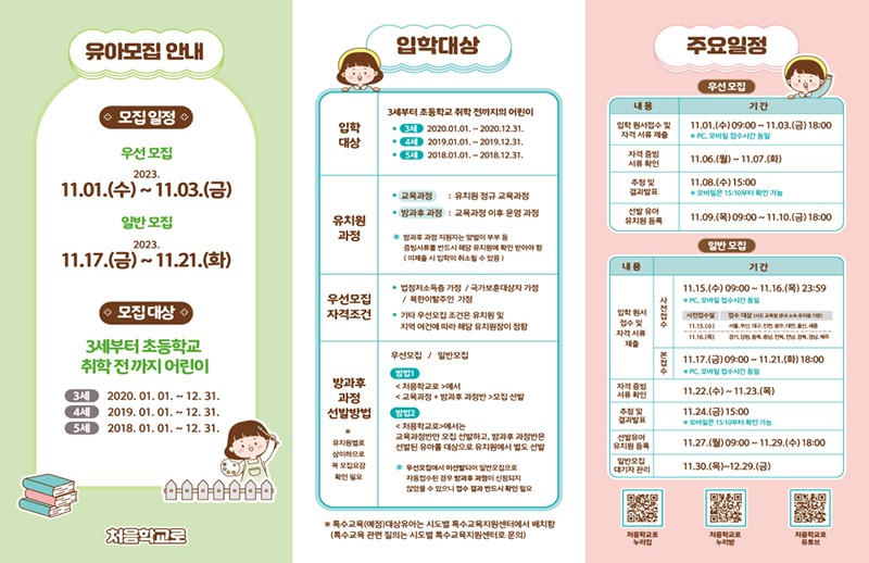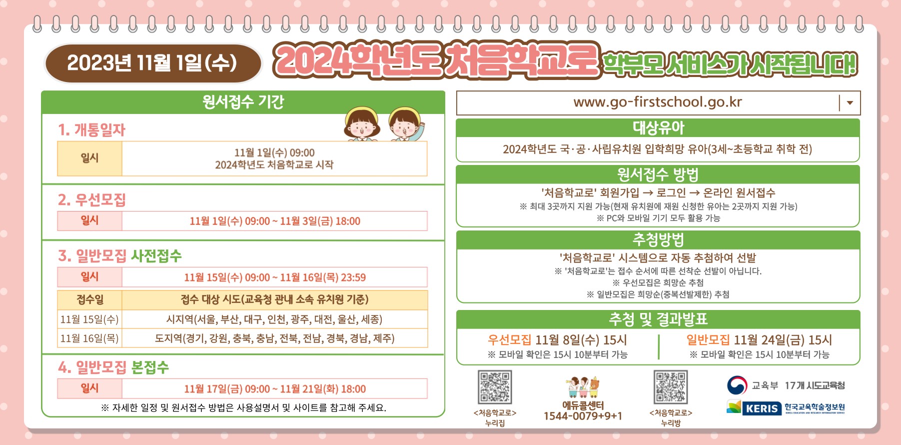 한국 교육부와 한국교육학술정보원은 2024학년도 국, 공, 사립유치원의 유아모집을 위한 혁신적인 서비스 '처음학교로'를 1일 부터 제공한다고 밝혔습니다.
