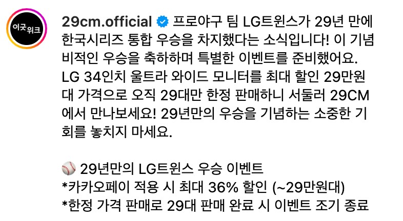 29CM에서 진행하는 LG트윈스 우승 기념 이벤트도 있어 같이 소개합니다. 선착순 29명만 혜택을 받을 수 있다고 하니 필요하신 분들은 서둘러 혜택 받아보세요.